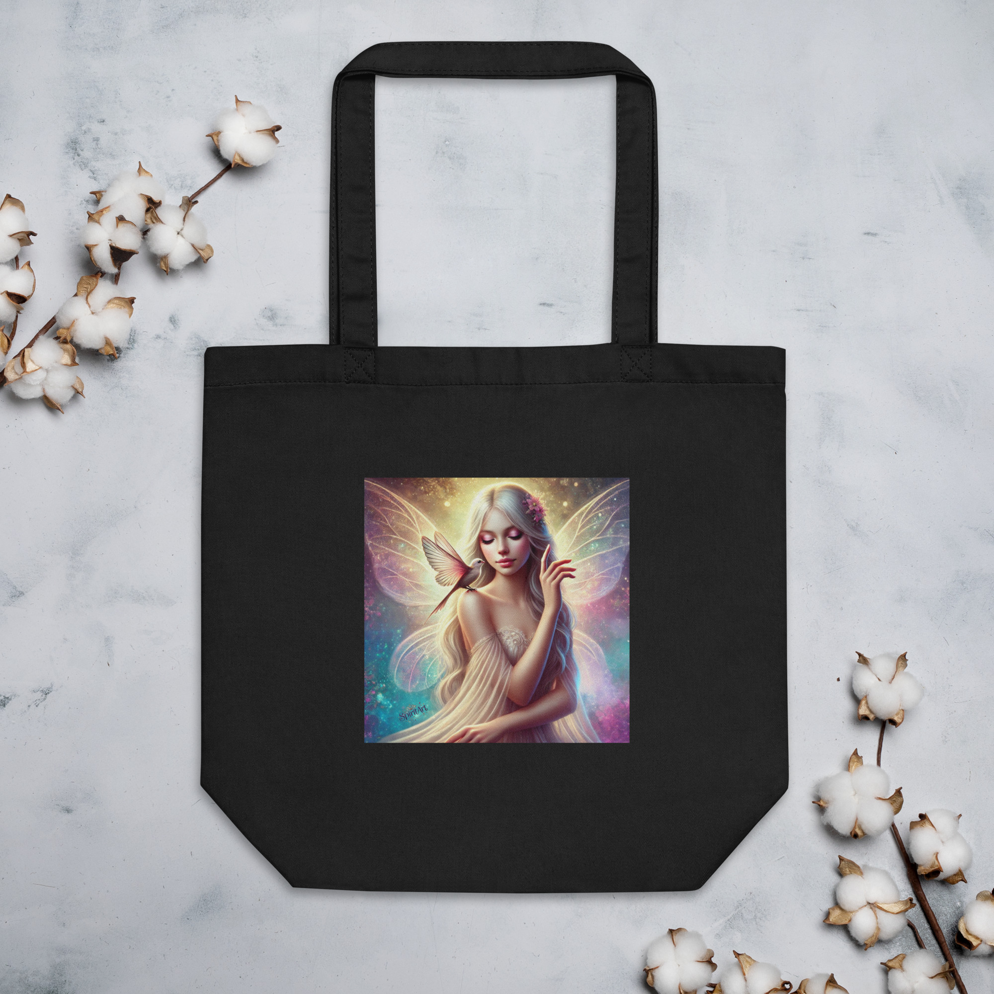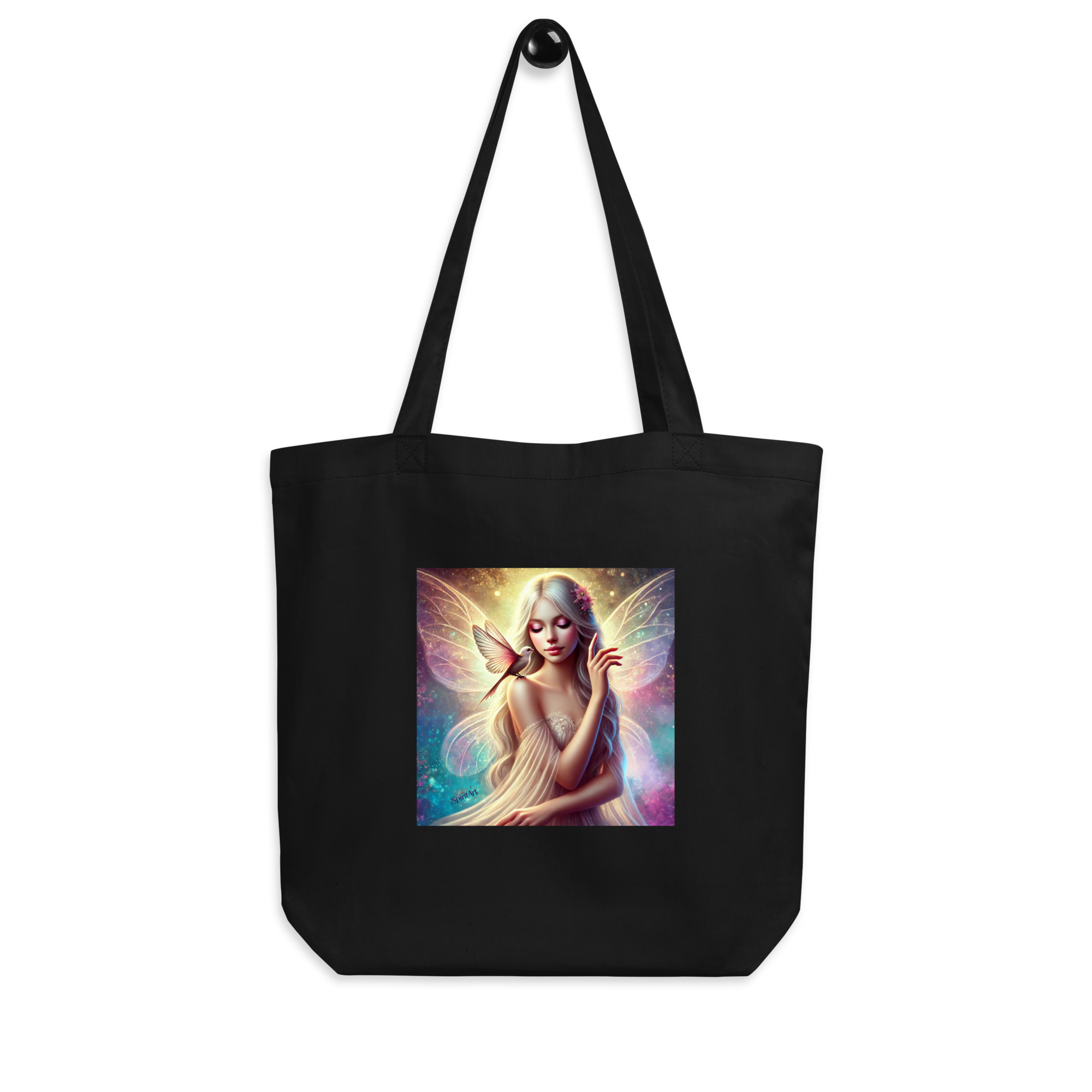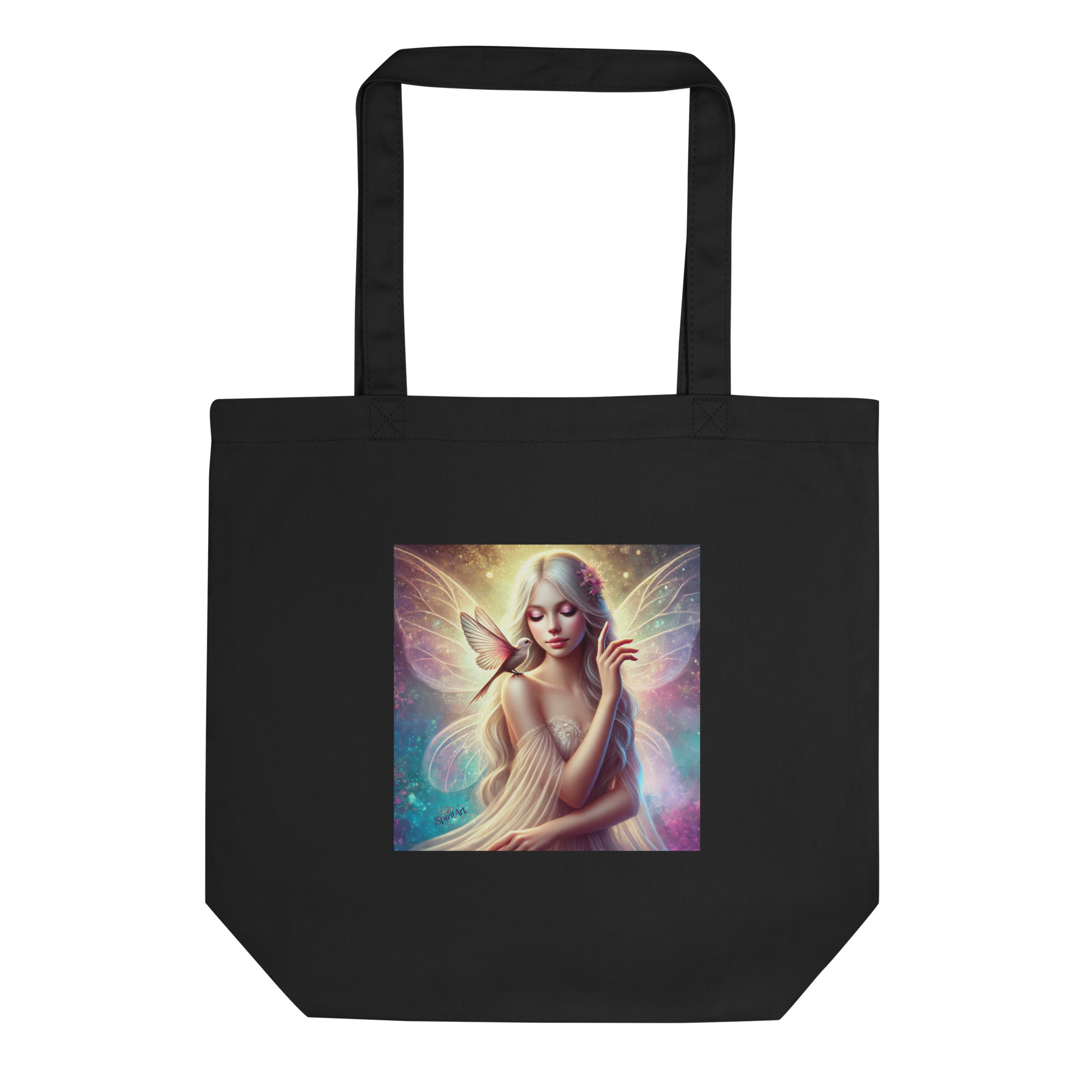 Carry a touch of magic wherever you go with our eco-friendly tote bag featuring the enchanting “Whispering Wings” design. This stunning artwork showcases a delicate fairy adorned with flowing silver hair, luminous wings, and a gentle bird perched on her shoulder, symbolizing a serene connection to nature. The soft pastel hues and intricate details evoke a sense of grace, fantasy, and inner peace.