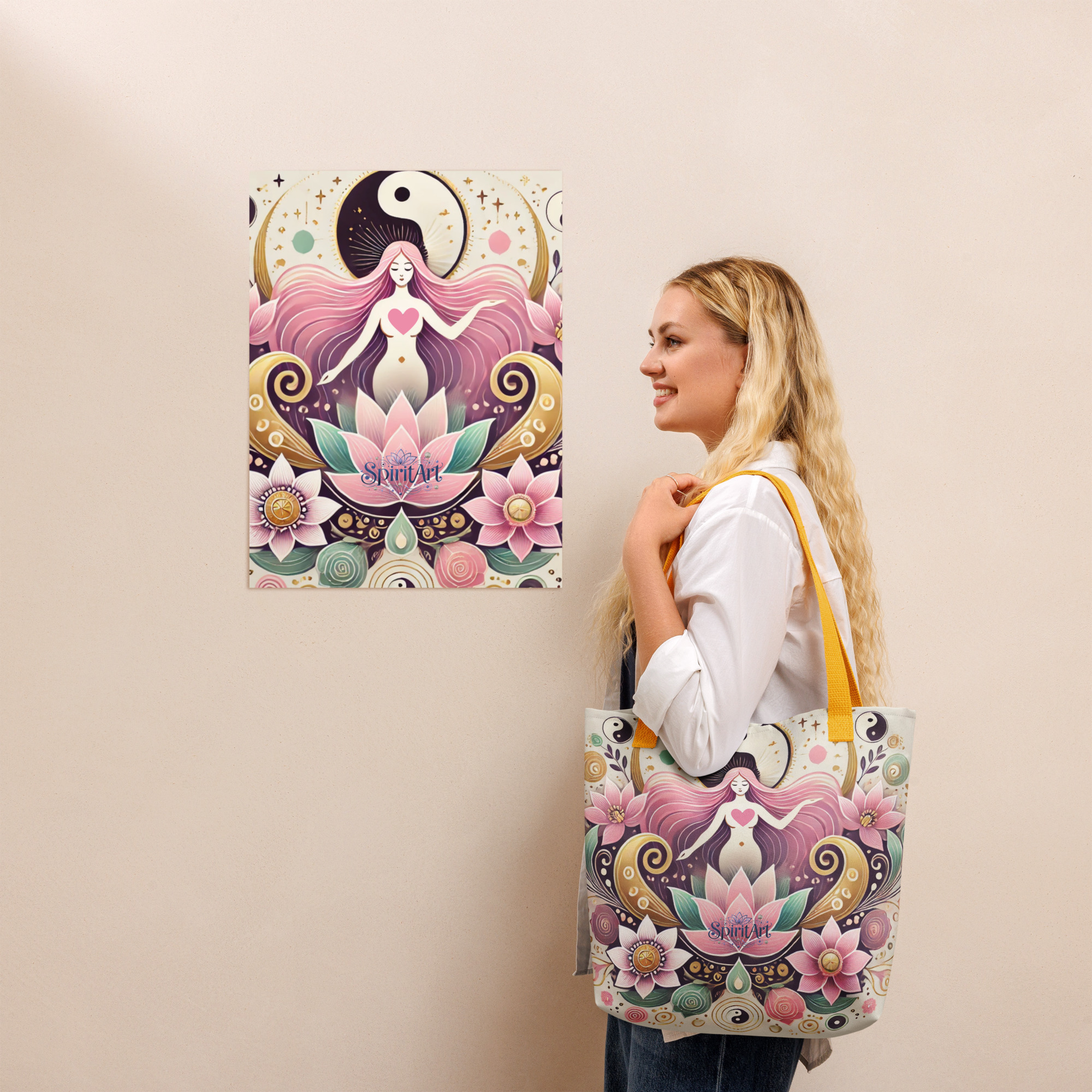 A serene and powerful design symbolizing the Divine Feminine and fertility. Featuring a graceful goddess figure surrounded by lotus flowers, crescent moons, and spirals, this artwork evokes growth, spirituality, and inner harmony. Perfect for bringing a touch of feminine energy to your daily life