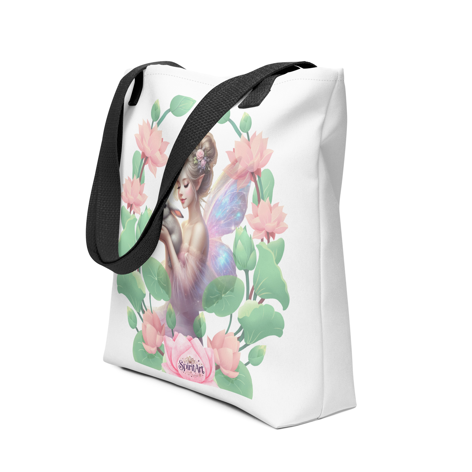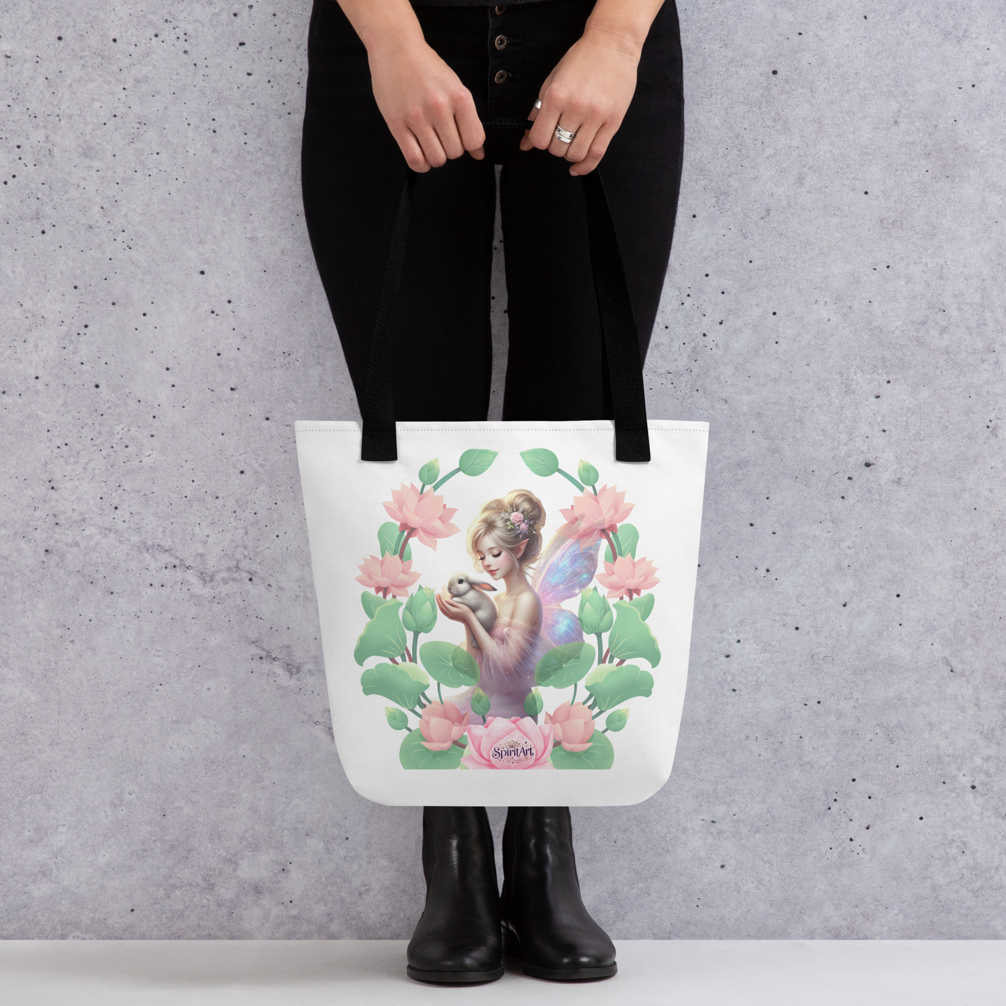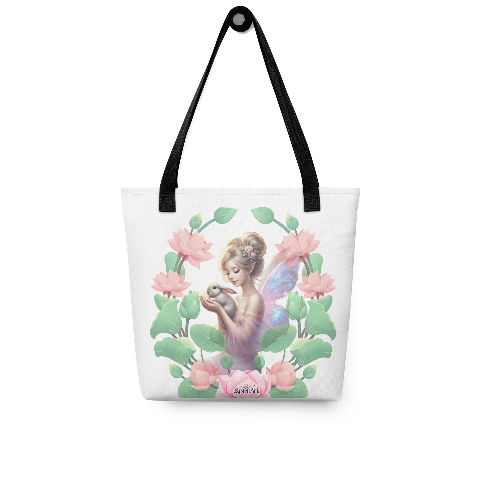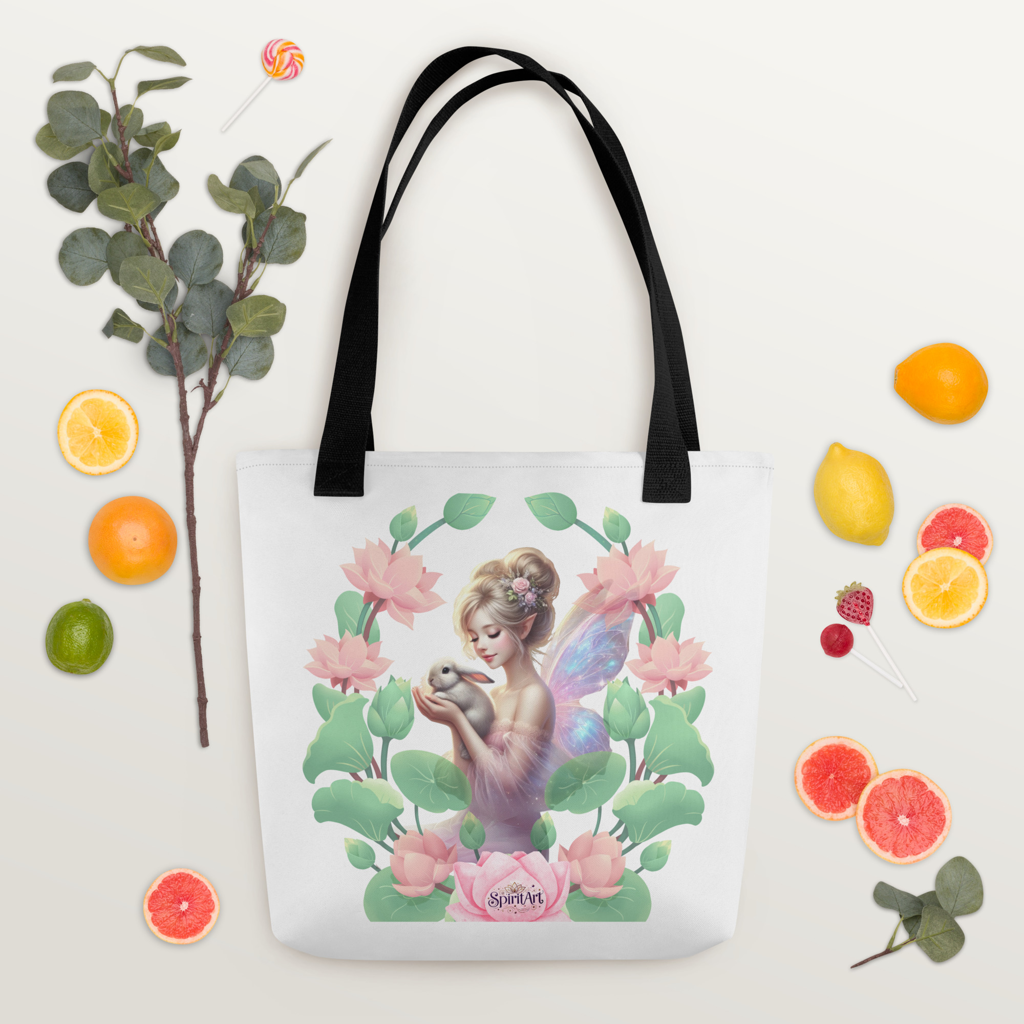 Step into a whimsical world with this enchanting tote bag featuring a serene fairy cradling an adorable rabbit. The artwork captures the magic of nature and gentle companionship, blending soft pastel hues with ethereal details to create a design full of tranquility and wonder. Perfect for carrying your daily essentials in style, this eco-friendly tote bag is ideal for fairy lovers, nature enthusiasts, and those who cherish a touch of magic in their lives. Lightweight, durable, and versatile, it’s a charming addition to your collection or a thoughtful gift for someone special.